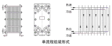 板式換熱器根據(jù)介質的溫差和流量,可以裝配成單流程、雙流程、三流程以及多流程的形式。單流程是指介質在換熱器內流過一個流程,雙流程是指介質在換熱器內折返流過兩個過程,依次類推,各種流程的外形圖和其流程示意圖如圖3。當采用多流程時,換熱器的四個接口就不能在同一側的夾緊板上,進出口要位于前后兩個夾緊板上。