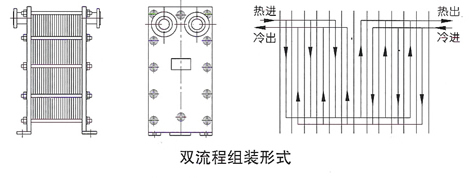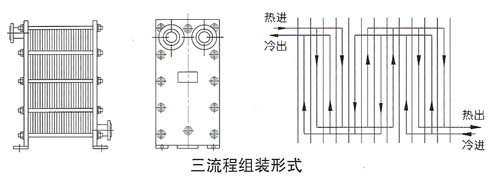 當兩種介質的流量不同且大致為2:1且不易裝配成雙流程時,可選擇該類型的換熱器。它適用于小區(qū)集中供熱,一般一次網(wǎng)的熱水流量較小,二次網(wǎng)用戶取暖供水的流量較大的場合。