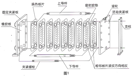 板式換熱器的結構分解如圖1,產(chǎn)品外型如圖2,主要部件是由換熱板片、密封膠墊、夾緊板、導桿、夾緊螺栓組成。換熱板片是由不銹鋼板壓制成型,它上面開有4個流道孔,中部壓成人字形波紋,四周壓有密封槽。密封槽內粘有密封膠墊。換熱板片通過兩導桿定位對齊,兩夾緊板通過夾緊螺栓將各板片壓緊,從而形成換熱器內腔換熱流道。相鄰換熱板片的人字形波紋方向安裝時相反,接觸點彼此相互支撐。人字形波紋和這些支撐點使流體介質在其內部流動時充分形成湍流,這是板式換熱器具有很高換熱效率的主要原因。另外換熱板片厚度較薄,導熱熱阻較小,板片兩側的流體介質流動分布較為均衡,也使得傳熱較為充分。