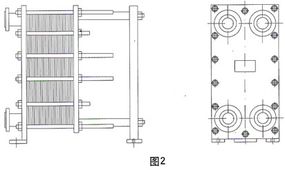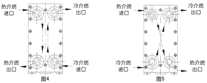 BR型的特點是,換熱板片和密封膠墊都是相同的,板片上四個流道孔的大小相同,同種介質在一側的兩個流道孔進出,如圖4,不能形成對角流動的形式,裝配時相鄰換熱板片調轉180°,使人字型方向相反。裝配后兩流道的橫截流通面積相同。